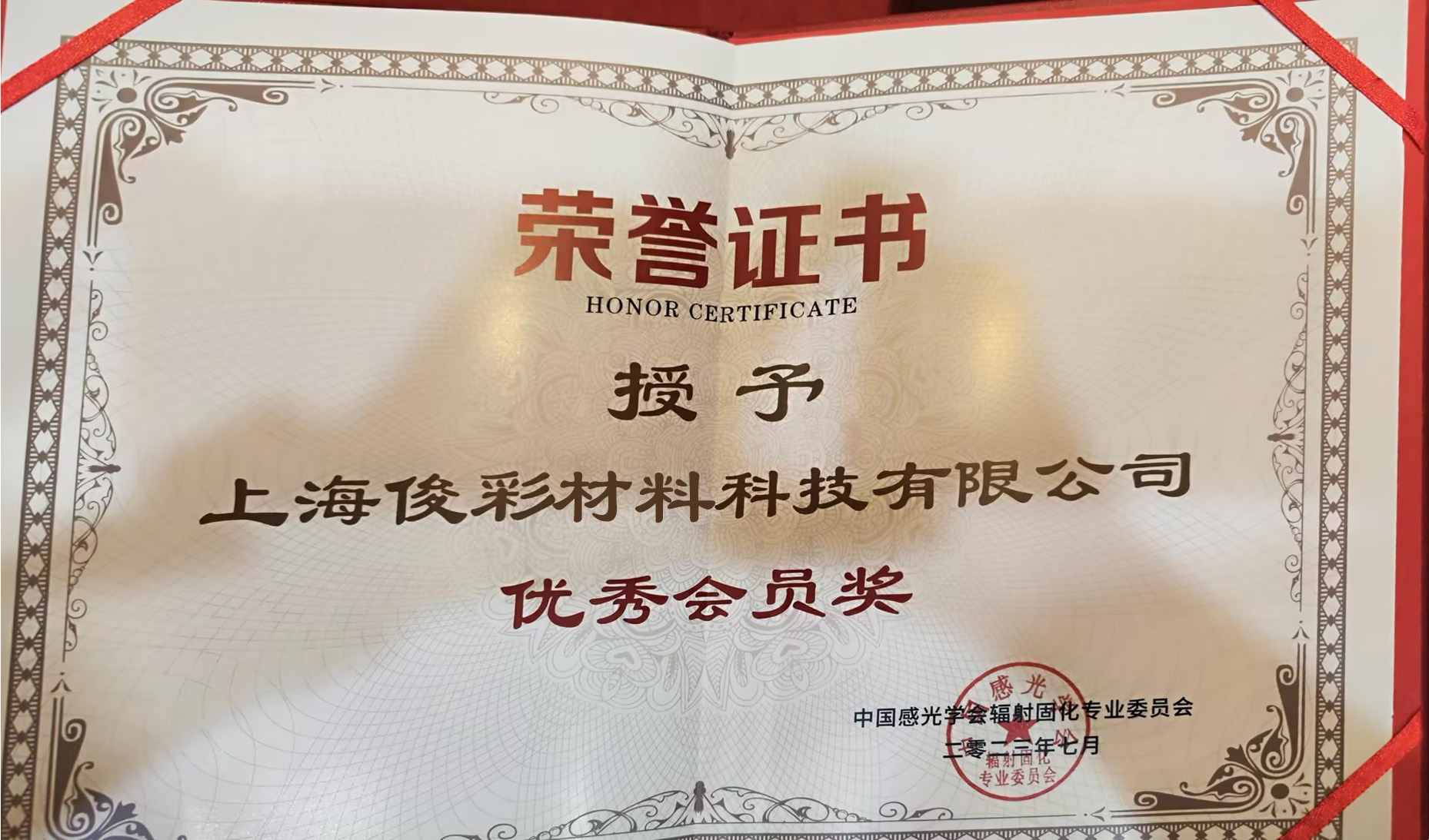 中國感光學(xué)會輻射固化專業(yè)委員會為上??〔什牧峡萍加邢薰绢C發(fā)了“優(yōu)秀會員”證書,對俊彩為推動中國輻射固化行業(yè)發(fā)展所作的貢獻(xiàn)表示肯定,并對俊彩的未來寄予厚望!